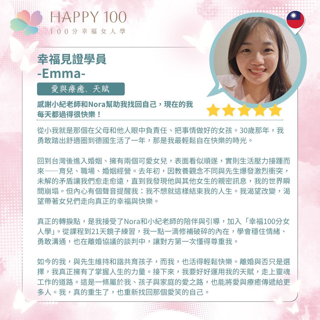 在「100分幸福女人學」中,我為學員打造了一套流程與系統,讓每個人有機會從內在開始,逐步走向「 100分的幸福人生」。